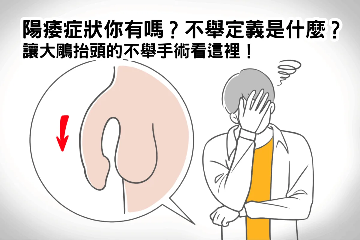 緊要關頭正要提槍上場,卻發現多年戰友一蹶不振嗎?陽痿這兩個字,可說是男性同胞們的可怕夢魘,一有風吹草動,就會擔心自己是不是有陽痿症狀,那到底該如何判斷自己是不是不舉呢?其實國際上可是有「不舉程度」的不舉定義,即使真的不舉泌尿科也是個救鳥一命的好所在,通常只要經過不舉治療,很快就能讓小老弟昂頭挺胸,重拾光彩!別著急,跟著泌密會客室,先來為戰友們做個簡單檢查,再來看看陽痿症狀能有什麼樣的治療方法吧!